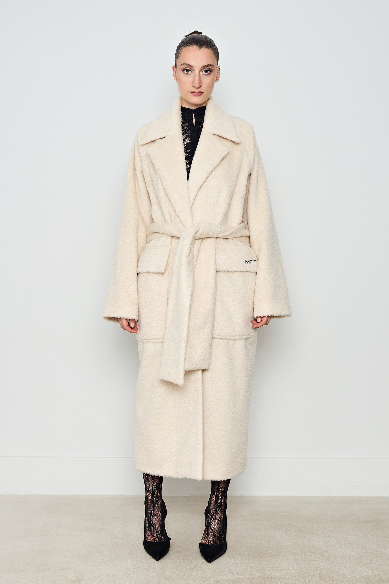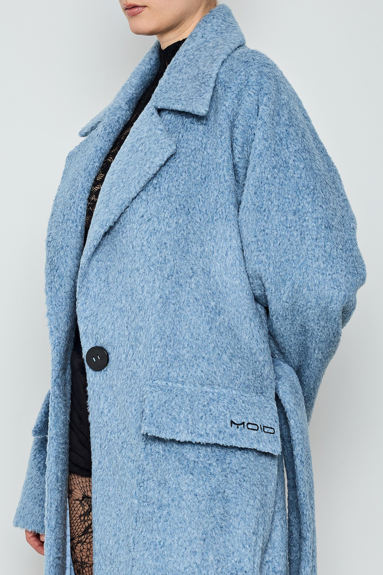 A luxurious oversized coat featuring MOID embroidery on pocket. With a sharp collar and lapel, maxi length, and button closure, it offers both elegance and sophistication. The adjustable tie at the waist allows for a custom fit.This coat combines timeless style with modern versatility, making it the ultimate outerwear choice for any occasion.
