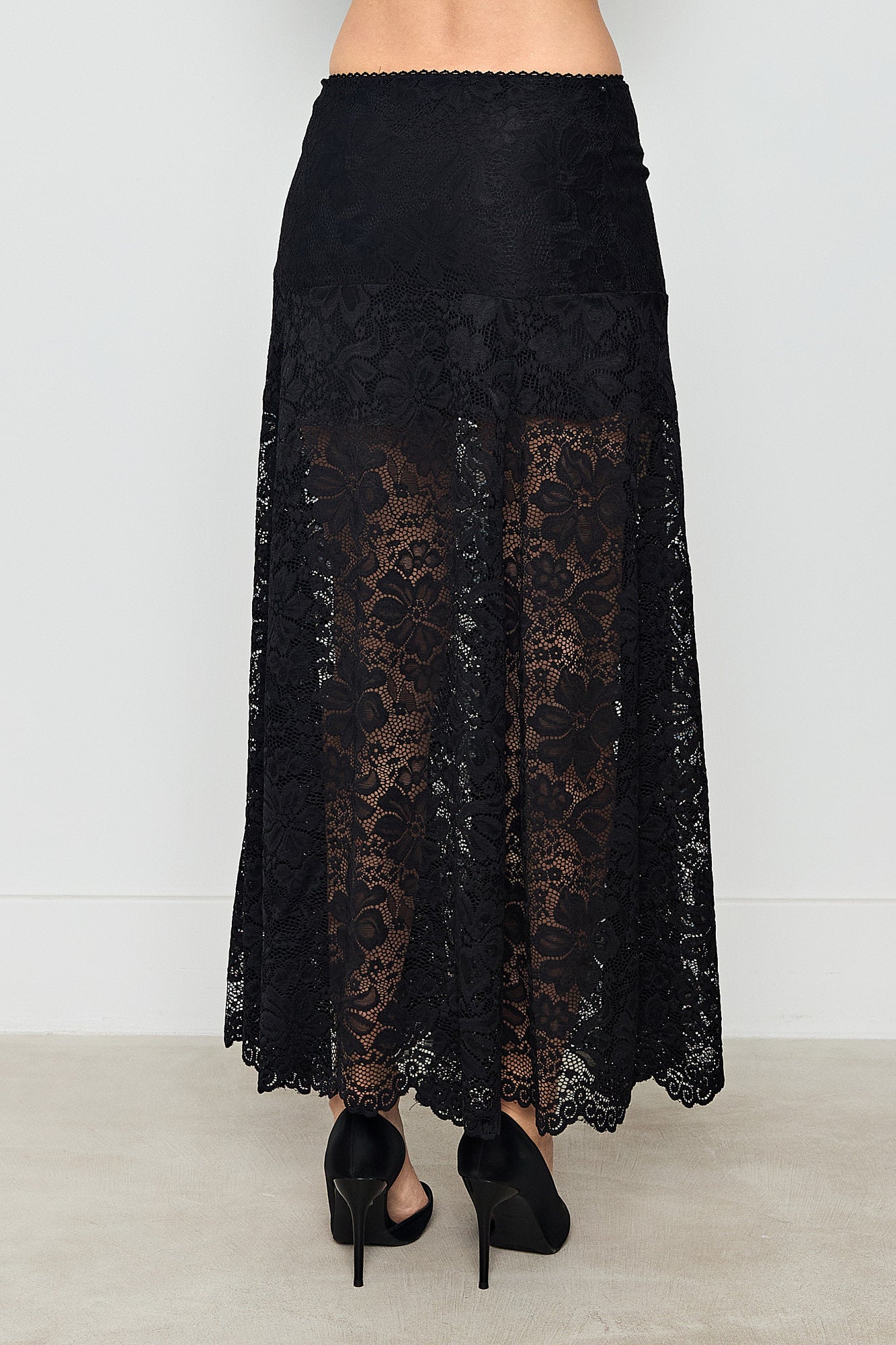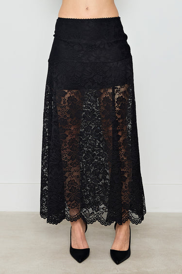A floral lace skirt with a sheer, romantic finish and a soft mini lining underneath.