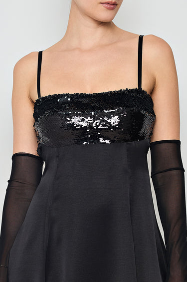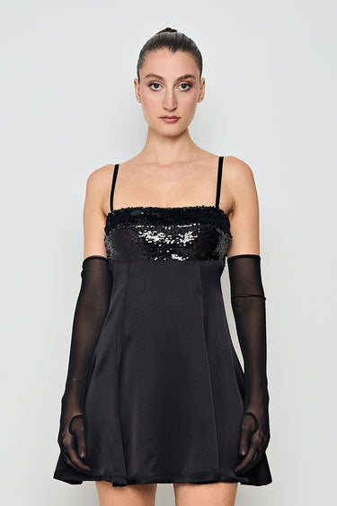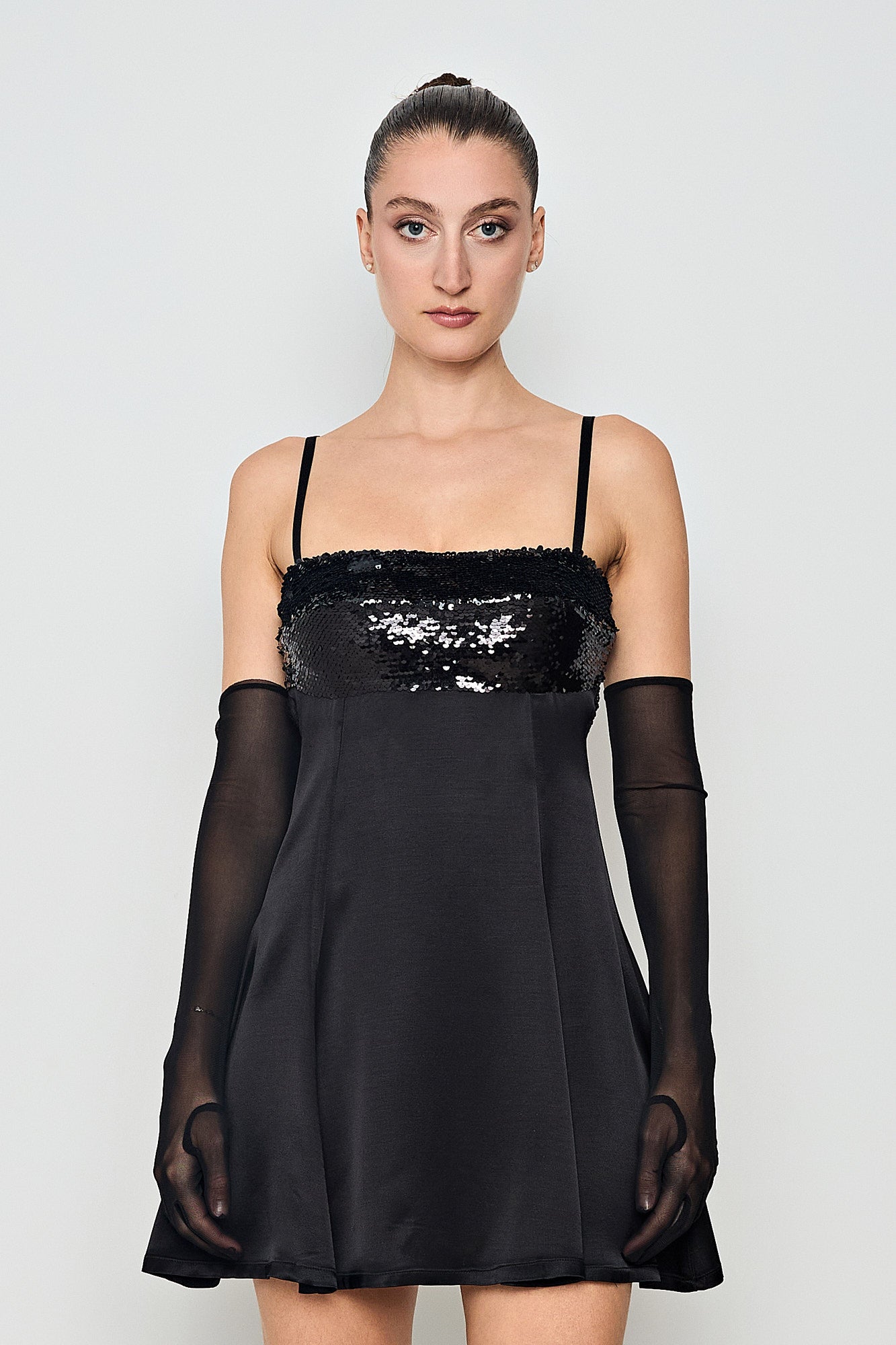 A striking black mini dress featuring a sequined bust and a fluid satin skirt that moves beautifully with every step.